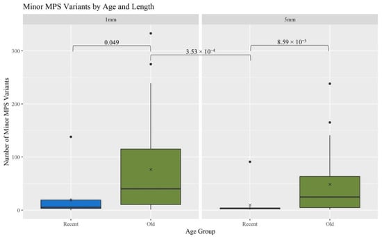 Boxplots for the comparison of the number of reported minor MPS variants for each age group and length (n = 74; nR = 26, nO = 48). The ‘x’ on the boxplots represents the mean and the line represents the median. Brackets show comparisons with significant p-values (p < 0.05).