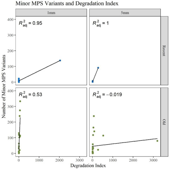 Linear regression of the number of reported minor MPS variants compared to the calculated degradation index for each age group and length (n = 74; nR = 26, nO = 48).