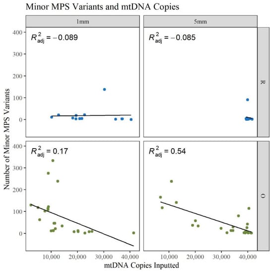 Linear regression of the number of reported minor MPS variants compared to the number of mtDNA copies inputted to the amplification reaction (n = 74; nR = 26, nO = 48).