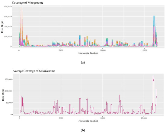 (a) A linear plot of the read depth across the mitogenome for the 15 samples that experienced amplicons dropping below 200 reads. (b) A linear plot of the average read depth for all 74 recent and old samples across the mitogenome.