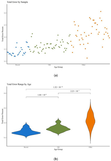 As stated in the Materials and Methods section, 23 hairs ranging from 41 to 46 years old were also subjected to mitogenome MPS analysis. While the coverage and read depth were sufficient to generate at least partial haplotypes for each hair, they resulted in noticeably noisier sequences. McElhoe and Holland [29] previously generated an R script to characterize the background noise in MiSeq MPS data. This method was used to calculate the total error rate per sample and the top 25 highest positions of error per nucleotide for all 120 hair samples tested. Figure 10a supports the expectation that higher error rates are seen in older samples. This increase in error rate is statistically significant among all three age categories (Figure 10b; Table S5, Supplementary Materials) and aligns with expectations given qualitative assessments of the sequencing data. While the average error rate for each age category is relatively low, falling well below the minor variant reporting threshold of 2%, a higher average may translate into a greater number of individual nps where the noise exceeds the threshold.