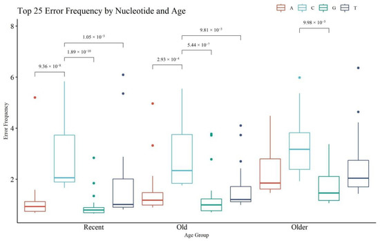 Figure 11 provides an assessment of the top 25 nps with the highest rate of noise or error, on a per nucleotide basis (i.e., A, C, G, T) (see Table S6, Supplementary Materials for the top 25 positions and their frequencies). Statistical significance was calculated within each age category and across the same nucleotide (significant p-values for within each age category only are presented in Figure 11). The R and O hairs had significant differences in the frequency of noise between C and any other nucleotide; the VO hairs had significantly different error frequencies between C and G calls. A, G, and T calls were significantly higher in VO hairs compared to R hairs (see Table S7, Supplementary Materials for all p-values). These trends align with the paradigm that older hairs contain more damaged DNA which in turn is associated with noisier MPS data. The rate of A, G, and T error generally fell below the 2% reporting threshold, with certain sites above the threshold in the older hairs that appear as reportable mixed sites. The rate of C substitutions is generally the highest in all age groups and was above 2% in all age categories. The T error was the next highest, followed by A and then G error. The elevated C error rate can be attributed to a combination of the filtering limitations of the MiSeq with respect to A/C detection and the alignment and sequencing challenges associated with homopolymeric C stretches in the control region [26,40]. The higher rate of T error compared to A and G can be explained by the observed deamination damage (C > T mutations), which has been previously noted as a predominate error type in hair samples [29].