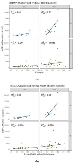 Linear regression of the mtDNA quantity compared to the width of the hair. (a) Width including the medulla. (b) Width excluding the medulla.