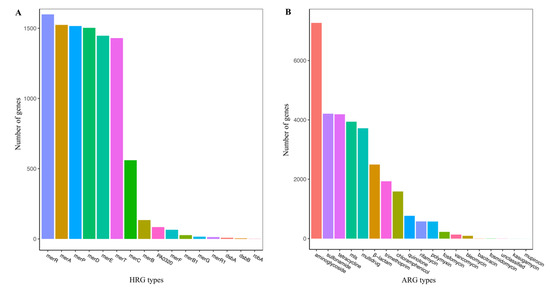 We speculate that the correlation between ARGs and HRGs might be attributable to a co-selection mechanism [48]. For instance, at a water treatment plant that disinfected surface water, the number of HRGs and ARGs related to multidrug, β-lactam, and aminoglycoside resistance increased [46]. Evolutionary events that lead to the emergence of new microbial antibiotic resistance factors are rare, while transmission events of widespread resistance genes are common [48]. As key drivers of horizontal gene transfer, plasmids harboring both HRGs and ARGs can be transferred at seemingly high rates via several mechanisms [49]. For example, Hg pollution in soil accelerates the transfer of ARGs among bacteria [50,51].