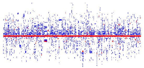 Visualization of the co-distribution of HRGs and ARGs in plasmids. Each plasmid is denoted by a vertical column, and the length of the HRGs (red), ARGs (blue), and all the other genes (white) represent the gene length. A maximum of 200 genes flanking the merA gene (in red) of each plasmid are visualized using Gcluster [47].