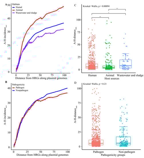 ARG and HRG co-distribution by the host source (A,C) and pathogenicity (B,D). (A,B) Change in the A-H-incidenceave (the average number of ARGs within a specified distance of HRGs among all plasmids with an increased distance. (C,D) A-H-distancemin (average minimum distance between ARGs and HRGs among all plasmids. * p < 0.05 and ** p < 0.01 based on Wilcoxon rank-sum test after a significant Kruskal–Wallis.