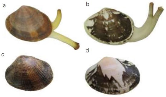Specimens of R. philippinarum and R. variegatus were collected in Zhanjiang, Guangdong Province, China. The collected animals were transported to the laboratory of the Liaoning Engineering Research Center of Dalian Ocean University. The clams were temporarily maintained for one week in seawater with a temperature of 17 °C, salinity of 30 ppt, and pH 7.76–8.5, and were fed Chlorella. During this time, the degree of separation between the clams’ incurrent and excurrent siphons was observed to facilitate sorting of the two species to ensure the accuracy of the experimental material. In R. variegatus, the tubes appear completely separated at the base (Figure 2a), whereas in R. philippinarum the tubes are separated a short distance from the distal end (Figure 2b). The radial ribs of R. philippinarum are raised, thin, and closely spaced, and number approximately 90–100 (Figure 2c), while those of R. variegatus are more flattened and number approximately 50–70 (Figure 2d). Measures of shell length, shell width, shell height, soft-tissue dry weight, and hypertrophy in R. variegatus and R. philippinarum are given in Table 1. The values of the measured phenotypic traits did not differ significantly between species (p < 0.05).