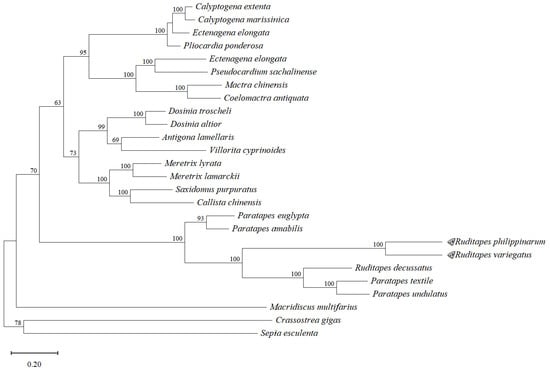 To accurately determine the position of R. philippinarum in a phylogeny with R. variegatus, the whole-genome nucleotide sequences of 24 mollusk species were downloaded from GenBank (https://www.ncbi.nlm, accessed on 12 October 2021). These included species of Vesicomyidae (4 species), Mactridae (4 species), Veneridae (14 species), Sepiidae (1 species), and Ostreidae (1 species), with the Sepiidae and Ostreidae representing exogenous populations. Gene-length information and GenBank accession numbers by species are listed in Table 2. The whole-genome length of the mitochondrial DNA is approximately 15,000–22,000 bp. A phylogenetic tree was constructed for R. philippinarum and R. variegatus using the maximum-likelihood method and the whole-mitochondrial DNA genome sequences of the 24 downloaded mollusk species, with a bootstrap test value set to 1000.