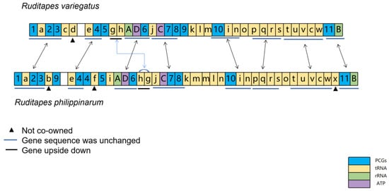 The comparative sequence of mitochondrial genes between R. philippinarum and R. variegatus shows high gene sequence similarity (Figure 6); their mitochondrial DNA share eight identical gene clusters, namely 1-a-2-3, e-4, A-D-6, C-7-8, 10-i-n, p-q-r-s, t-u-v-c-w, and 11-B (short blue lines). Moreover, the sequential order of these eight gene clusters is consistent in the mitochondrial genomes of R. philippinarum and R. variegatus, and no gene separation occurred during evolution. The highly similar order of mitochondrial genes indicates that R. philippinarum and R. variegatus are phylogenetically close, affirming the result that R. philippinarum and R. variegatus have phylogenetic proximity. Second, the gene cluster g-h of R. philippinarum and R. variegatus are mutually reversed in the arrangement; the gene trnP-AGG in R. variegatus was not found in R. philippinarum; and the genes trnY-ATA, trnP-TGG, and trnS-TCT in R. philippinarum mitochondria were absent in R. variegatus.