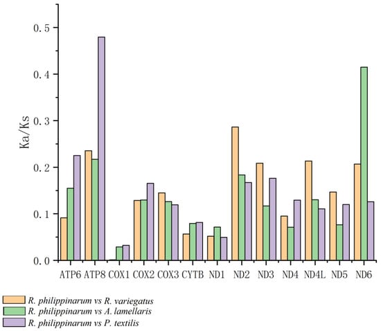 The Ka/Ks ratios of the 13 PCGs of R. philippinarum and R. variegatus versus those of A. lamellaris or P. textilis all yielded values of <1. Moreover, the Ka/Ks values of the genes COX1, COX2, COX3, CYTB, ND1, and ND4 are small and have similar values. The alignment of R. philippinarum to the ATP8 gene of P. textilis revealed that the Ka/Ks values of the ATP8 gene of R. philippinarum (0.479: R. philippinarum vs. P. textilis) were significantly greater than those of the ATP8 gene of R. variegatus (0.133: R. variegatus vs. P. textilis). With A. lamellaris as the alignment target, the Ka/Ks value of the ATP8 gene of R. variegatus is 0.003 (R. variegatus vs. A. lamellaris), which is close to 0, while that of the ATP8 gene of R. philippinarum is 0.217 (R. philippinarum vs. A. lamellaris), and the difference was significant.