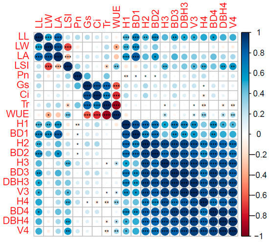 Pearson correlation coefficients among different traits. Note: (Pn): net photosynthesis rate; (Ci): intercellular CO2 concentration; (Gs): stomatal con-ductance; (Tr): transpiration rate; (WUE): water use efficiency; (LL): leaf length; (LW): leaf weight; (LA): leaf area; (LSI): leaf shape index; (H1): 1-year-old tree height; (H2): 2-year-old tree height; (H3): 3-year-old tree height; (H4): 4-year-old tree height; (BD1): 1-year-old ground diameter; (BD2): 2-year-old ground diameter; (BD3): 3-year-old ground diameter; (BD4): 4-year-old ground diameter; (DBH3): 3-year-old diameter at breast height; (DBH4): 4-year-old diameter at breast height; (V3): 3-year-old volume; (V4): 4-year-old volume; *: Significant correlation at the 0.05 level (1-tailed); **: Significant correlation at the 0.01 level (2-tailed); ***: Significant correlation at the 0.001 level (2-tailed).