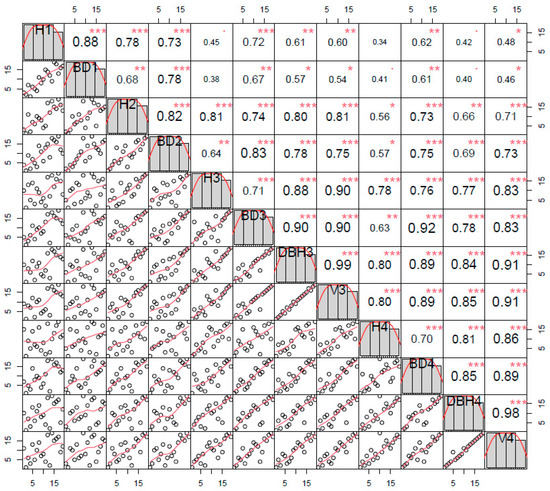 Rank correlation coefficients among different traits. Note: (H1): 1-year-old tree height; (H2): 2-year-old tree height; (H3): 3-year-old tree height; (H4): 4-year-old tree height; (BD1): 1-year-old ground diameter; (BD2): 2-year-old ground diameter; (BD3): 3-year-old ground diameter; (BD4): 4-year-old ground diameter; (DBH3): 3-year-old diameter at breast height; (DBH4): 4-year-old diameter at breast height; (V3): 3-year-old volume; (V4): 4-year-old volume; *: Significant correlation at the 0.05 level (1-tailed); **: Significant correlation at the 0.01 level (2-tailed); ***: Significant correlation at the 0.001 level (2-tailed).