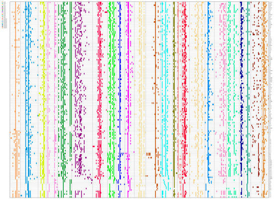 The alleles at each locus in each sample were coded into a fingerprint in the form of a 0/1 matrix based on bands amplified using 24 pairs of primers. Fingerprinting gives a visual representation of the differences for each sample (Figure 1). As could be found from the fingerprinting of 140 oil-tea camellia accessions, these 24 pairs of primers could discriminate some of the 140 accessions.