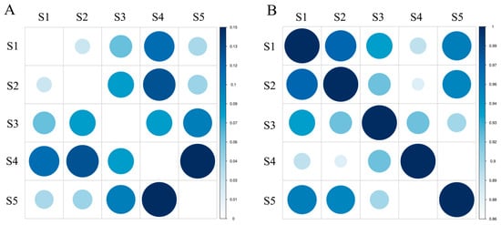 Nei’s genetic distance (D) is a measure of genetic difference among biological populations and can be measured in terms of quality traits and also with quantitative traits. The estimation of genetic distance is important for exploring the origins of cultivars, analyzing the relationships among populations, mapping phylogenetic trees and predicting heterosis, and guiding parental selection. The range of genetic identity among species was 0.8616–0.9719, calculated from 285 amplified fragments. As shown in Figure 2, S1 and S2 had the smallest genetic distance (0.0285) and the largest genetic identity (0.9719) with the closest relatives, followed by S1 and S5. S5 and S4 had the largest genetic distance (0.1490), shared the least genetic identity (0.8616), and were the most distantly related, followed by S4 and S2. The results of AMOVA indicated that most of the genetic variation (77%) occurred within species and only a small fraction (23%) occurred among species (Table 5). In addition, there were significant differences within and among groups. The mean fixation index (Fst) among five groups showed moderate genetic differentiation (Fst = 0.231).