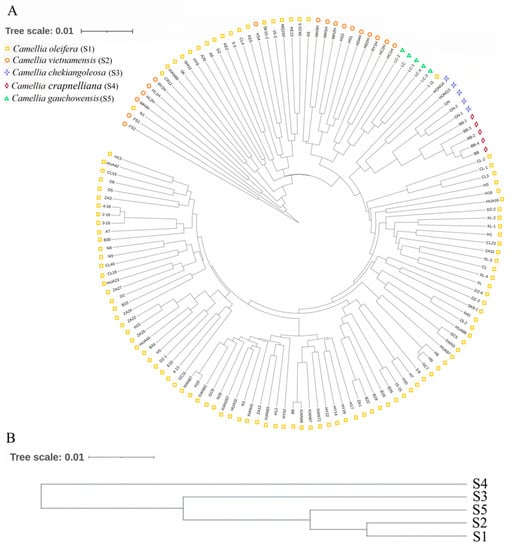 Oil-tea camellia trees is the collective term for a group of plants of high economic value. There are approximately 50 species of these trees, and they belong to the family Theaceae [1]. Oil-tea camellia trees have high value and a wide range of uses. They can be used as chemical bioenergetics, chemical feedstock, and a nutrient source [2,3]. Oil-tea camellia trees have a long history of cultivation in China and are mainly distributed in areas south of the Yangtze River Valley [4,5]. The main cultivated species are Camellia chekiangoleosa, Camellia oleifera, Camellia crapnelliana, Camellia vietnamensis Huang, etc. [5,6]. Nevertheless, the quality and oil yield of oil-tea camellia trees may vary depending on the species [3]. Thus, it is essential to form molecular markers for identification of populations or species to support breeding improvement and promote the development of genetic resources for oil-tea camellia trees.