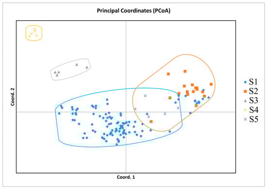 3.4. UPGMA and PCoA Analysis