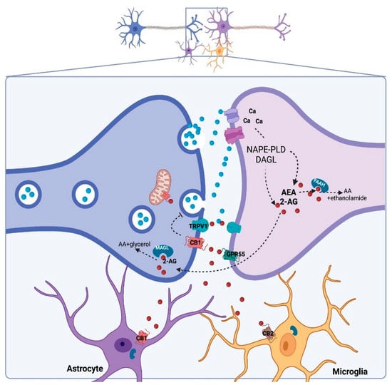Canonical tripartite eCB signaling in the brain. Neurotransmitter-induced depolarization in the postsynaptic neuron and increased calcium concentration triggers the synthesis of anandamide (AEA) and 2-arachidonoylglycerol (2-AG) by NAPE-PLD and DAGL, respectively. The eCB can activate specific receptors (CB1, CB2, TRPV1 and GPR55) and/or follow degradation by FAAH and MAGL [31].