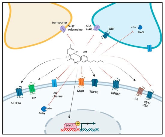 Since CBD displays such low affinity for CB1 and CB2 receptors, many studies with CBD have attempted to characterize CB1- and CB2-independent effects for this phytocannabinoid. It is now known that CBD binds to a wide variety of targets, including receptors (primarily PPARγ, GPR55, TRPV1, 5-HT1A, 5-HT3, mu-opioid, A2 and GABAA), enzymes (MAGL and FAAH), transporters (monoamines, glutamate and eCB) and ion channels, among others [14,42] (Figure 3). This might explain the multitude of CBD effects on neurotransmitter release, cell signaling, gene expression and protein levels, cell cycle control, oxidative stress and inflammation [43]. Altogether, the polypharmacology of CBD may explain its ability to be effective against diverse pathologies by recruiting different mechanisms depending on the system compromised in the given condition [14,43,44]. The promiscuity of CBD on its targets also poses a challenge in deciphering its precise mechanism of action, which remains mostly unclear, especially in psychiatric disorders.