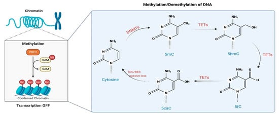 Amongst the epigenetic mechanisms that influence chromatin remodeling and regulation of gene expression is DNAm, characterized by the transfer of a methyl group, donated by S-adenosylmethionine, onto the C5 position of the cytosine to form 5-methylcytosine (5mC) [65]. In most mammalian cell types, DNAm occurs primarily on a CpG dinucleotide, and it is associated with repression of transcription if it happens in promoter regions, while in gene bodies, it is associated with an increase or decrease in transcription [66]. The methylation of DNA is catalyzed by a family of enzymes called DNA methyltransferases (DNMTs) (Figure 4). While DNMT1 functions during DNA replication to copy the DNAm pattern from the parental DNA strand onto the newly synthesized daughter strand, DNMT3a and DNMT3b can establish a new methylation pattern for an unmodified DNA sequence and are thus are known as de novo DNMTs [65].