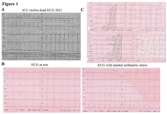 He recovered consciousness but presented delirium and anterograde amnesia with stable hemodynamics. Coronary angiography showed no significant lesions, present peripheral pulses, a Glasgow score of 15, his twelve-lead ECG showed normal sinus rhythm, a PR interval of 160 milliseconds, a normal QRS complex, and a borderline QTc value of 436 milliseconds (Figure 1A). Moreover, repeated resting ECG and ECG during mental arithmetic stress showed a QTc value of 400 milliseconds and 457 milliseconds, respectively (Figure 1B). His father, a 73-year-old man, had no past medical history of cardiovascular disease. He complained of an episode of malaise in 2017 when driving his car. His twelve-lead ECG at rest and during mental arithmetic stress showed a prolonged QTc interval of 460 milliseconds and 485 milliseconds, respectively (Figure 1C).