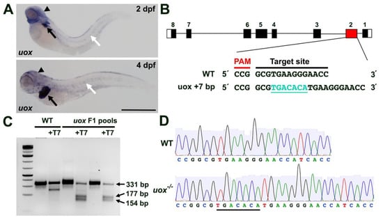 Expression analysis of uox in zebrafish using whole mount in situ hybridization (WMISH) showed expression at 2 dpf in the developing liver, with weaker diffuse expression in the head and along the horizontal myoseptum (Figure 2A). By 4 dpf, this expression pattern remained, with strong expression in the liver and weaker expression in extrahepatic tissues (Figure 2A), consistent with a previous study [38]. To generate the uox knockout line, we used CRISPR/Cas9 gene editing to target exon 2 and create a premature termination codon early in the transcript (Figure 2B). Potential founder fish (F0) were individually outcrossed to WT, and pools of F1 embryos were screened by PCR and the T7 endonuclease I assay (Figure 2C). Embryos from positive founder fish were raised to adulthood, and the specific mutations were identified by Sanger sequencing. A +7 bp insertion mutation was identified that was then bred to homozygosity, hereafter referred to as uox−/− (Figure 2B,D). This mutation was predicted to cause a premature termination codon after the first 30 aa of the 303 aa uricase protein.