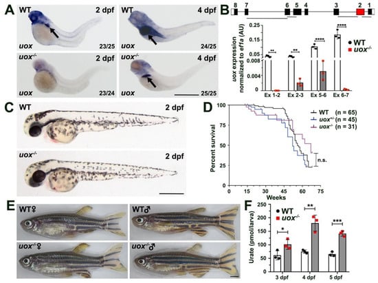 The +7 bp mutation in the uox gene results a null allele and uox−/− zebrafish are morphologically normal, fertile and possess elevated levels of urate. (A) Expression of uox in 2 and 4 day post fertilization (dpf) WT and uox−/− larvae, as detected by WMISH (arrows mark the liver). Numbers in the lower right corner of each panel indicate the frequency of larvae showing the displayed expression pattern. (B) Expression of uox in WT (white bars) and uox−/− (grey bars) larvae at 4 dpf, as detected by qPCR using four independent exon-spanning primer pairs (Ex 1-2, Ex 2-3, Ex 5-6 and Ex 6-7, as shown in schematic). Data generated from three biological replicates, n = 10 larvae per group. Schematic shows the location of the four primer pairs in the uox gene. Statistical significance determined using multiple unpaired Student’s t-tests with Holm–Sidak correction. (C) Representative brightfield images of WT and uox−/− larvae at 2 dpf. (D) Kaplan–Meier survival curve of WT, uox+/− and uox−/− fish from 1 month to 18 months of age. Statistical significance determined using the log-rank (Mantel–Cox) test. (E) Representative brightfield images of age-matched female and male WT and uox−/− adult fish. (F) Quantification of urate (pmol urate/larvae) from dissociated 3, 4 and 5 dpf WT (white bars) and uox−/− (grey bars) larvae, as detected using a Roche C311 autoanalyzer. Data generated from three biological replicates, n = 40 larvae per group. Statistical significance determined using multiple unpaired Student’s t-tests. Error bars in (B,F) represent means ± SDs. Abbreviations: n.s. not significant, * p < 0.05, ** p < 0.01, *** p < 0.001 and **** p < 0.0001. Scale bars: 500 µm in (A,C), 2 mm in (E).