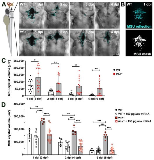 Microinjected MSU crystals persist in uox−/− larvae. (A) Representative confocal imaging (transmitted light views, Z-projections) of WT and uox−/− larvae at 1, 2, 3 and 4 days post-injection (dpi) with MSU crystals into the hindbrain ventricle (injected at 2 days post fertilization (dpf)). A cyan border outlines MSU crystals. (B) A representative reflection image of MSU crystals in a WT larva at 1 dpi (same larva as in (A)), pseudo-coloured in cyan. The lower panel shows a standard deviation Z–projection of the binary mask in black and white. (C) Quantification of MSU crystals (μm3), as detected in (B), within individual WT (white bars) and uox−/− (grey bars) larvae at 1, 2, 3 and 4 dpi (3, 4, 5 and 6 dpf, n = 15 larvae per group). Statistical significance determined using multiple unpaired Student’s t-tests with Holm–Sidak correction. (D) Quantification of MSU crystals (μm3) within individual WT (white bars) and uox−/− (grey bars) larvae at 1, 2 and 3 dpi (3, 4 and 5 dpf) and within WT (white bars) and uox−/− (grey bars) larvae injected with 150 pg uox mRNA (n= 5 and 15 larvae per group for the non-mRNA-injected and mRNA-injected groups, respectively). Statistical significance determined using a 2-way ANOVA and Tukey’s multiple comparisons test. Error bars in (C,D) represent means ± SDs. * p < 0.05, ** p < 0.01, *** p < 0.001 and **** p < 0.0001. Scale bar 100 µm.