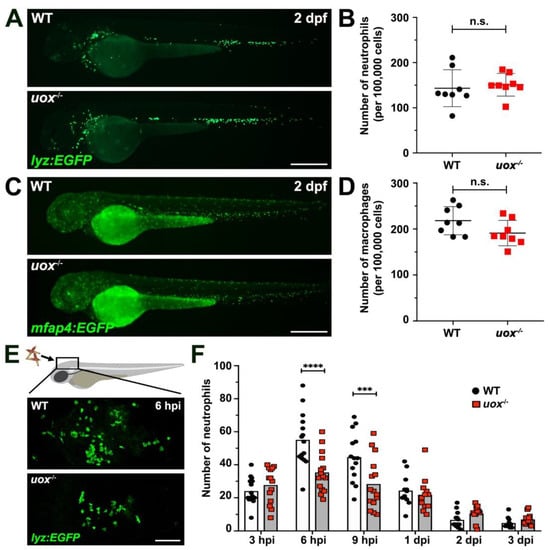 Uricase-deficient larvae demonstrate unaltered myelopoiesis and dampened neutrophil recruitment towards MSU crystal challenge. (A) Live imaging of neutrophils within 2 day post fertilization (dpf) WT and uox−/− Tg(lyz:EGFP) larvae. (B) Flow cytometry quantification of neutrophils within 2 dpf WT and uox−/− Tg(lyz:EGFP) larvae (n = 8 groups per genotype, 20 larvae per group). (C) Live imaging of macrophages within 2 dpf WT and uox−/− Tg(mfap4:EGFP) larvae. (D) Flow cytometry quantification of macrophages within 2 dpf WT and uox−/− Tg(mfap4:EGFP) larvae (n = 8 groups per genotype, 20 larvae per group). Statistical significance in (B,D) determined using unpaired two-tailed Student’s t tests. (E) Immunofluorescent detection of neutrophils within the hindbrain ventricle of WT and uox−/− Tg(lyz:EGFP) larvae, at 6 h post MSU crystal injection (hpi). (F) Quantification of neutrophil recruitment, as detected in (E), within WT (white bars) and uox−/− (grey bars) Tg(lyz:EGFP) larvae at 3, 6 and 9 hpi and 1, 2 and 3 days post MSU crystal injection (dpi), n = 12–15 larvae per treatment. Statistical significance determined using multiple unpaired Student’s t-tests with Holm–Sidak correction. Error bars in (B,D,F) represent means ± SDs. Abbreviations: n.s. not significant, *** p < 0.001 and **** p < 0.0001. Scale bars: 200 µm in (A,C,E).