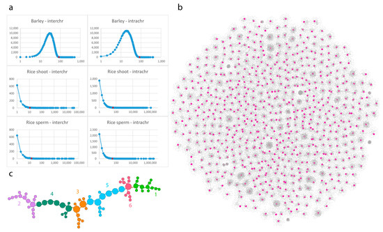 Contact graph construction and analysis. (a) Contacts per bin distribution of selected Hi-C libraries. The curve shows the number of bins that have a given contact count. The x-axis is logarithmic, and shows contact count; the y-axis is linear and shows the number of bins. On the charts, a red dot shows the cut-off value for each analysis (see numbers in the Section 2 of the manuscript). For further downstream analysis, only bins that have a frequency of this value or higher were used. In all cases, self-loops were discarded and not counted. (b) A 2D representation of interchromosomal filtered contacts of barley (See methods). Magenta nodes represent bins that have 14, or more than 14, edges in the graph. The layout indicates that contacts between the non-homologuous chromosomes are organized by dedicated genomic regions, suggesting hierarchical genomic structures. (c) The largest subgraph after filtering for bins of 14 or more different contacts. An intriguing linear layout of contacts has emerged, suggesting a signal transduction “highway” that might function like Newton’s cradle. Colors represent the clusters of the graph. The clusters were characterized by gene enrichment analysis which revealed housekeeping genes within the regions represented by the bins.
