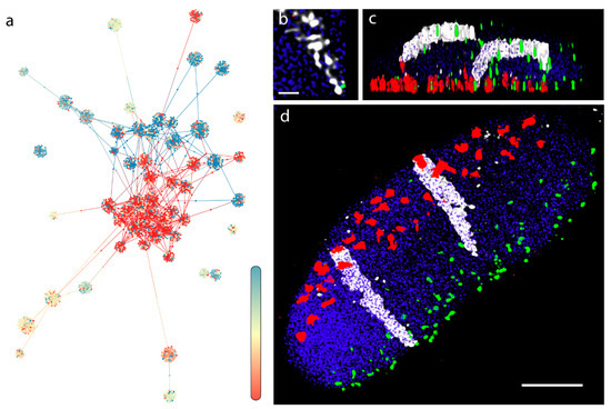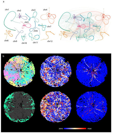The pseudo-structure obtained by the multigraph representation thus reflects features resembling nuclear organization observed on optical sections collected from telomere-centromere-labelled 3D nuclei captured by high-resolution microscopy and visualized by 3D rendering (Figure 6b). Mapping expression data along the constructed multigraph model provides a powerful tool which instantly highlights transcriptional hotspots relative to interchromosomal contact frequencies (Figure 4b,c).