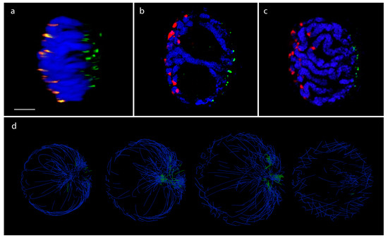 In situ and in silico. Fluorescence in-situ hybridization (FISH) showing centromeres (orange, red) and telomeres (green) on a 3D-fixed barley mitotic nucleus. Barley centromeres are labelled by the barley centromere-specific G+C repeat probe (red) while telomeres are visualized by the plant telomeric repeat sequences (TRS) used as a probe (green). Chromosomes are counterstained with DAPI. Bar = 5 μm. (a) Side view of a 3D-rendered z-stack captured from a barley mitotic nucleus. (b,c) FISH on individual image frames of a barley mitotic nucleus showing polarized centromere-telomere arrangement and chromosome arms laying parallel with the telomere-centromere axis. (d) In silico, cross-section images of the pseudo-structure of Barley genome. Green indicates telomeric regions. A well-distinguished nucleolus-like region is visible inside the spherical topology. Telomeres are clustered on one side of the spherical model.