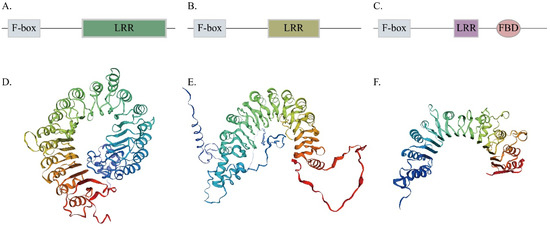 The classification of FBXL proteins. (A–C) Group-Ⅰ, Group-Ⅱ, and Group-Ⅲ domain structures, respectively. (D–F) Three-dimensional structure of representative genes of Group-Ⅰ, Group-Ⅱ, and Group-Ⅲ.