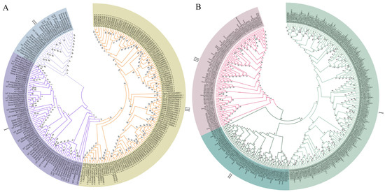 Phylogenetic relationship among FBXL proteins. (A) 227 FBXL genes from 3 plant species analyzed regarding the phylogenetic relationship. (B) 348 FBXL genes from 4 cotton species analyzed regarding the phylogenetic relationship. The two maximum likelihood (ML) phylogeny trees were constructed by the MEGA 7.0 software. The bootstrap method was used and replicated 1000 times. (I: Grpup I; II:Group II; III: Group III).