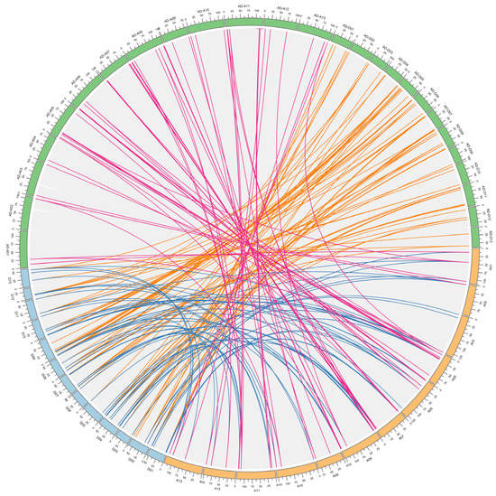 The TBtools software and the BLAST (basic Local Alignment Search Tool) were used to locate the FBXL genes on the chromosomes of 4 cotton species and all the protein sequences were incorporated into the local database [51]. The whole protein sequence was used as a query to search the above database, and its e-value was 1 × 10−5. The results of blastp were analyzed by MCSCAN, and a collinear block covering the whole genome was produced. The collinear pairs belonging to the FBXL family were extracted and a collinear diagram was drawn by the Circos and TBtools software [47,56,57].