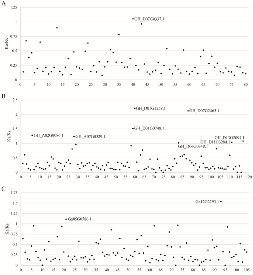 The distribution of Ka/Ks ratio of orthologous pairs between GhFBXL, GrFBXL, and GaFBXL. (A) Ka/Ks analysis of GhFBXL-GhFBXL. (B) Ka/Ks analysis of GhFBXL-GrFBXL. (C) Ka/Ks analysis of GhFBXL-GaFBXL.