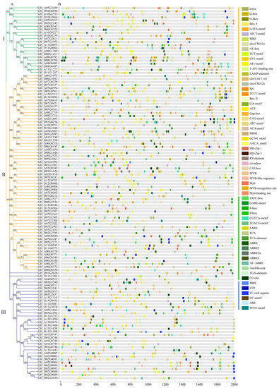 - Lescot, M.; Dehais, P.; Thijs, G.; Marchal, K.; Moreau, Y.; Van de Peer, Y.; Rouze, P.; Rombauts, S. PlantCARE, a database of plant cis-acting regulatory elements and a portal to tools for in silico analysis of promoter sequences. Nucleic Acids Res. 2002, 30, 325–327. [Google Scholar] [CrossRef]