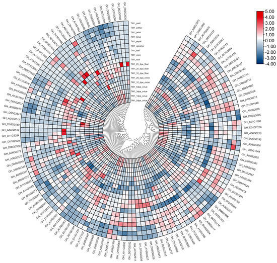 RNA-Seq data were obtained from the Cotton Omics Database (http://cotton.zju.edu.cn/10.rnasearch.html, accessed on 15 September 2021) to analyze differentially expressed genes under different tissues [43]. RNA-seq data were evaluated by quantitative RT-PCR (qRT-PCR). Total RNA was extracted from roots, stems, leaves, and anthers (bud size < 3 mm, 4–5 mm, 5–8 mm, and >8 mm) of Zhongmiansuo 100 (Gossypium hirsutum L., cultivated in Baibi Town, Anyang, Henan Province, China). The developmental stages of different anthers were divided as described by Koltunow [60] and Scot [61]. All the primer sequences are shown in Table S10. The GhActin gene was selected as the internal control gene. The experiment was repeated 3 times, and the relative expression level of the GhFBXL genes was calculated by the 2−∆ct method. The experimental reagents and instruments used were referred to by Zhu et al. [40].
