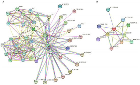 For the sake of analysis of the FBXL protein function, we used multiple sequences (Figure 9A) and a protein family (Figure 9B) search to analyze the interaction network by the STRING website (https://string-db.org/, accessed on 19 April 2022), based on Arabidopsis homologous genes.