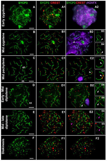 The stepwise analysis of meiotic prophase I made it possible to evaluate temporal and spatial interactions of homologous and nonhomologous chromosomes. To this end, we studied: (i) the localization of the SYCP3 protein, the main component of axial elements (AEs), and lateral elements (LEs) of the SC; (ii) kinetochore proteins (by means of an anti-CREST antibody); (iii) the γH2AFX protein, a marker of DSBs, asynaptic chromosomal regions, and the sex body; and (iv) H3K9me3, as a hallmark of heterochromatin. To clearly identify the meiotic prophase I stages, we use the criteria described in several articles [36,37,38,39]. In the mid-late zygotene, γH2AFX positive asynaptic sites are present, and an intense γH2AX signal is located around the XX bivalent that can occupy the entire space of the nucleus. Axial elements and bivalents seem to be slightly stretched or under slight tension. In the early–mid diplotene, the XX bivalent is shrouded in a weak γH2AFX signal, desynaptic sites do not have γH2AFX foci. Closer to the middle of the diplotene, the bivalents have an alternation of brighter and less bright SYCP3 regions.