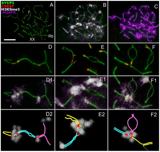 Meiotic contacts of nonhomologous chromosomes in zygotene and H3K9me3 histone distributions in E. alaicus spermatocytes. Immunostained nucleus (A–C), its enlarged parts (D–F,D1–F1), and schemes of meiotic contacts (D2–F2) are presented. Axial and lateral elements of the SCs were visualized using the anti-SYCP3 antibody (green). Kinetochores were detected using the anti-CREST antibody (red). Heterochromatin was detected by means of an anti-H3K9me3 antibody (white). Chromatin inactivation was revealed using an anti-γH2AFX antibody (violet). The non-Robertsonian chromosome is designated as 7 according to the karyotype [28,29]. The contact regions of nonhomologous bivalents are localized in the H3K9me3 clouds. Scale bar (A–С) = 5 µm.