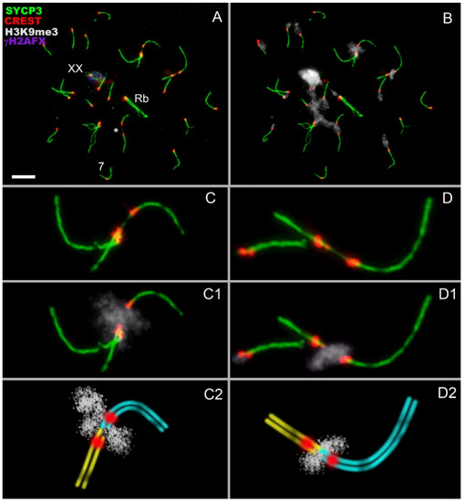Synaptonemal complex preparations were made and fixed according to Peters et al. [32], with some modifications [33]. Primary antibodies used for immunostaining: rabbit anti-synaptonemal complex protein 3 (SYCP3) antibodies (diluted 1:250, Abcam, Cambridge, UK); human anti-centromere Calcinosis Raynaud’s phenomenon, Esophageal dysmotility, Sclerodactyly, and Telangiectasia (CREST) antibody (CREST, 1:250, Fitzgerald Industries International, Acton, MA, USA); mouse anti-phospho-histone H2AX, also known as γH2AFX (diluted 1:250–500, Abcam), rabbit anti-H3K9me3 antibody (1:100, Abcam). As secondary antibodies, we used goat anti-rabbit IgG, Alexa Fluor 488-conjugate (Invitrogen, Carlsbad, CA, USA); goat anti-human IgG, Alexa Fluor 546-conjugate (Invitrogen, Carlsbad, CA, USA); goat anti-mouse IgG, Alexa Fluor 546-conjugate; and IgG, Alexa Fluor 555-conjugate (Invitrogen, Carlsbad, CA, USA) (diluted 1:300–800). Slides were washed in phosphate-buffered saline (PBS) and immersed into Vectashield with 4′,6-diamidino-2-phenylindole (DAPI) (Vector Laboratories, Burlingame, CA, USA). Slides were analyzed using a fluorescence light microscope Axio Imager D1 (Carl Zeiss, Jena, Germany). Immunostaining procedure was described previously [34,35].