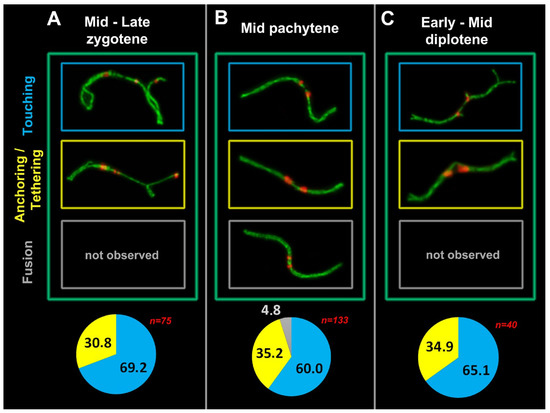 It is noteworthy that just the first three types of contacts are identifiable in zygotene. The ‘fusion’ type is detectable exclusively in pachytene and only in 5% of all meiotic contacts [20]. This makes logical sense because the synapsis of contacting bivalents ends in the early-to-mid pachytene, and only then are we able to immunodetect a fusion or a very close contact of lateral SC elements near short arms of two bivalents.