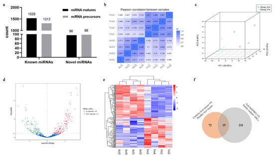 Evaluation of sequencing data and identification of candidate DEmiRNAs. (a) The number of miRNA matures and precursors from sequencing. (b) Pearson correlation heat-map of miRNA expression in different samples. R2—The square of Pearson’s correlation coefficients. (c) PCA plot between groups. Each point represents one sample. The red square represents a sample from Group_Act and the blue circle represents a sample from Group_Fre. (d) Volcano plot of miRNAs differentially expressed between Group_Fre and Group_Act. Each point represents one detectable miRNA. (e) Cluster of 230 DEmiRNAs between groups. Log10 (TPM + 1) values were used for clustering. (f) A Venn diagram of miRNA-seq data for HSCs and liver tissues. Four novel miRNAs in our data were not considered. Differentially expressed microRNAs, DEmiRNAs; principal component analysis, PCA; hepatic stellate cells, HSCs; microRNA sequencing, miRNA-seq; versus, VS.