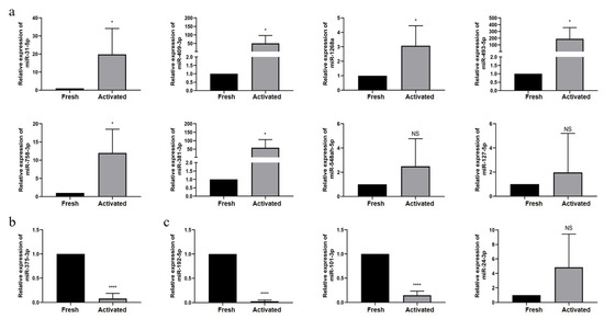 QRT-PCR validation of the expression of miRNAs. QRT-PCR validation of the expression of (a) miRNAs associated with liver diseases, (b) miR-375-3p, the miRNA associated with cirrhosis, and (c) miRNAs with contradictory expression. * p < 0.05, **** p < 0.0001, and NS, p ≥ 0.05 versus freshly isolated HSCs.