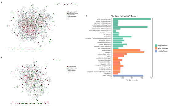 Construction of the co-expression networks for miRNAs–mRNAs and functional analysis of targeted genes. Construction of co-expression networks for (a) DEmiRNAs–mRNAs and (b) DEmiRNAs–DEmRNAs. Data with |Pearson’s correlation coefficient| ≥ 0.7 and p < 0.05 are shown in the networks. Red, green, and blue dots represent significantly upregulated miRNAs, significantly downregulated miRNAs, and targeted mRNAs, respectively. The pink and green lines represent positive and negative correlations, respectively. (c) Top 30 GO terms in the GO enrichment analysis of targeted DEmRNAs. Green, orange, and purple represent BP, CC, and MF, respectively. MicroRNA, miRNA; differentially expressed, DE; biological process, BP; cellular component, CC; molecular function, MF.