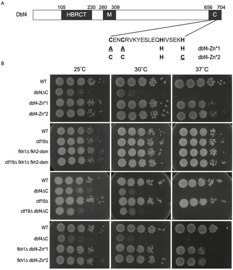 - Jones, D.R.; Prasad, A.A.; Chan, P.K.; Duncker, B.P. The Dbf4 motif C zinc finger promotes DNA replication and mediates resistance to genotoxic stress. Cell Cycle 2010, 9, 2018–2026. [Google Scholar] [CrossRef]
