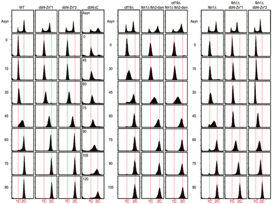 3.2. Dbf4∆C Is Defective in Overall Rate of Genome Replication While dbf4-Zn* and ctf19∆ Are Not