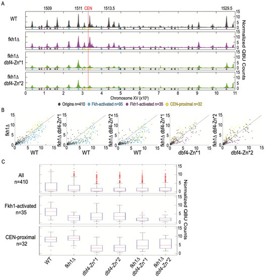 A typical feature sometimes distinguishing replication profiles is the peak width, which is inversely correlated with the overall level of origins firing, reflecting greater fork progression enabled by reduced numbers of total forks initiated [25]. In the dbf4-Zn* mutants, the dominant peaks were substantially wider than in WT cells, while much less QBU signal originated from other loci (Figure 3A,B). This result suggests that the relative rate of origin firing has tilted further in favor of a smaller number of origins, most of which are Fkh-activated origins. Given that both dbf4∆C and dbf4-Zn* mutant cells show preferential firing of Fkh-activated origins, and that deletion of FKH1 is lethal in combination with dbf4∆C, we conclude that the C-terminal Zn finger of Dbf4 is required for its recruitment to CEN-proximal origins but much less so for its recruitment through Fkh1/2. Still, there appears to be a defect in Dbf4-Zn* recruitment to other origins lacking either the Cft19 or Fkh1/2 mechanisms. In support of this, the dbf4-Zn* mutants show a more severe genome-wide replication defect than ctf19∆ cells, which are like WT cells in QBU profiles except for strong reduction in CEN-proximal origin firing (Figure 3A–C). Direct comparison of the changes in firing levels relative to WT (∆QBU) in ctf19∆ versus dbf4-Zn* strains illustrates their similar, stronger effects on CEN-proximal versus Fkh-activated origins (Figure 3D). As noted above, the dbf4-Zn* mutants also show a degree of temperature sensitivity not shown by ctf19∆ fkh1∆ fkh2-dsm cells, which lack both recruitment pathways and consequently show a highly disrupted pattern of origin initiation (Figure 3A–C). Still, these targeting-defective cells exhibit relatively robust origin firing densities compared with the dbf4-Zn* mutant strains (Figure 3A–C). Given the sensitivity of the C-terminal domain of Dbf4 to structural perturbation, we think the likeliest explanation is that the Zn-finger point mutations partly disrupt an aspect of Dbf4 structure/function leading to a mild, generalized replication defect (perhaps interaction with Mcm2) in addition to the fully penetrant defect in CEN-proximal origin targeting, presumably via the Ctf19 pathway.