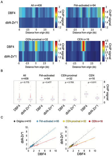 In this work, we have carefully examined and compared the cellular growth and viability, the rate of genome duplication, and the specific effects on individual origins genome-wide in DBF4 mutants lacking the 50-amino acid Zn-finger domain or bearing point mutations precisely targeting the Zn-finger motif. We compare these results with strains bearing mutations that eliminate one or both origin-stimulating pathways, Fkh1/2 or Ctf19. Our findings show that deletion of the entire C-terminal domain causes a severe defect in replication and viability. In contrast, mutation of the Zn finger motif has specific effects on targeting to CEN-proximal versus Fkh-activated origins. These results significantly revise the possible mechanisms involved in origins stimulation, particularly of Fkh-activated origins.