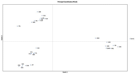 Principal Coordinates Analysis (PCoA) revealed four different population clusters (Figure 1). The first coordinate separated the cluster of African (AFR) populations on the right side. On the left side, we observed three different population groups: the European (EUR) populations in the upper part, the East Asian (EAS) populations in the lower section, and the South Asian (SAS) populations between them. The CLM, MXL, PEL, and PUR admixed populations clustered with the European populations, while the ACB and ASW populations clustered with the African (AFR) populations, reflecting their ancestry compositions.